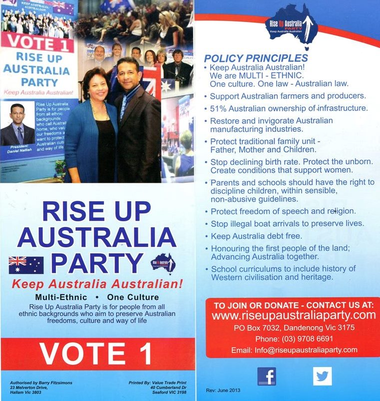 Right now, R.U.A. is classed as a crazy, doubtful, untried fringe group. People will be hesitant to be too close to it because it is painted as inexperienced, trouble stirring, especially, anti-islamic. Islamics presumably will not be inclined to vote for it. It has a nut-fringe image.