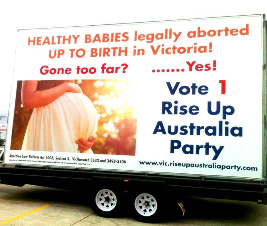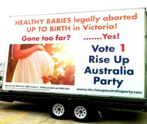 Let’s spread the word to ‘Vote # 1 Rise Up Australia Party’ at the Victorian State Election on 29th November 2014 to change Victoria’s terrible Abortion Law Reform Act which permits the mother to have an abortion right up to birth.  We must work together to save lives, as they are our next generation to ‘Keep Australia Australian’.