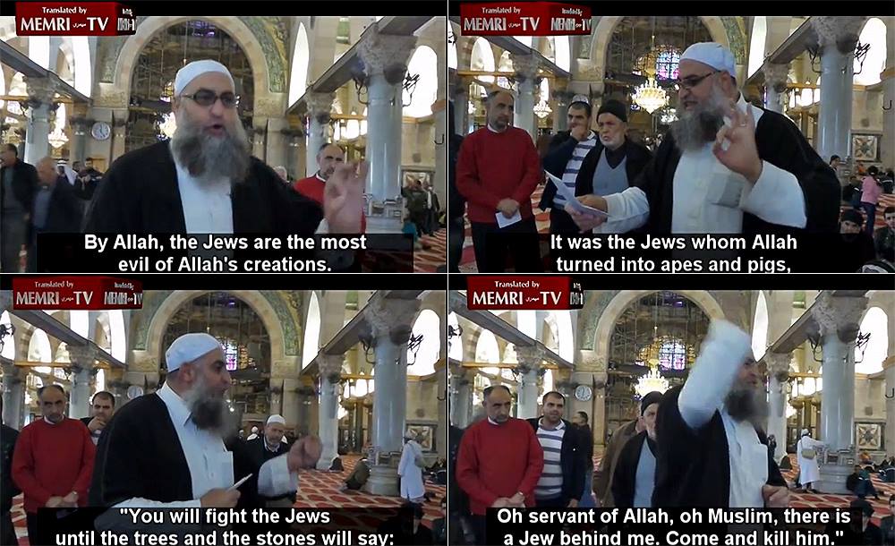 You may click the following link to read and to watch an Islamic preacher at the Al-Aqsa mosque on the Temple Mount in Jerusalem – Judaism’s holiest site – engaged in blatant incitement against Jews and Israel in an impromptu speech two weeks ago, in remarks translated by the Middle East Media Research Institute, including “I say to the Jews: the time for your slaughter has come,” he added. “The time to fight you has come, the time to kill you has come.”
