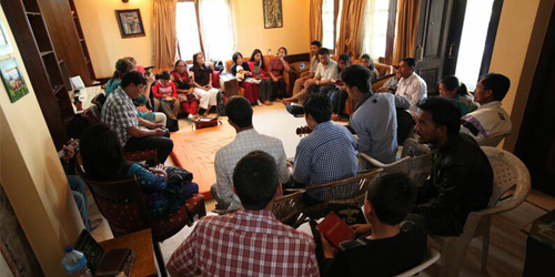 Members of a small Kathmandu church gather at an alternate place of worship one week after their building was damaged in the 7.8-magnitude earthquake in Nepal on April 25. IMB Photo