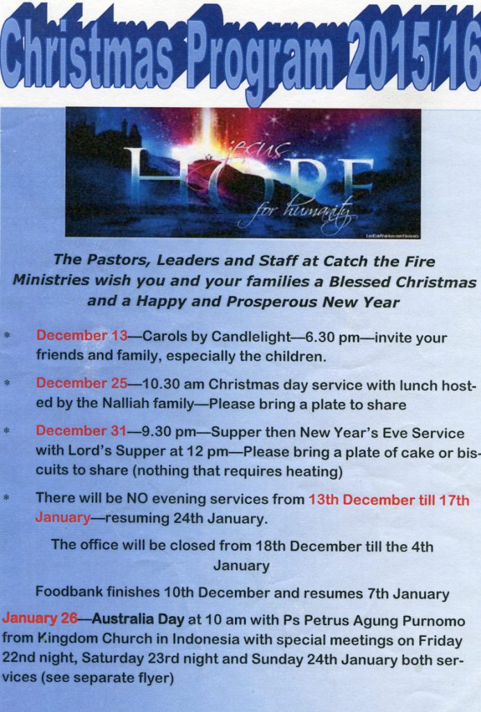 * December 25—10.30 am Christmas day service with lunch hosted by the Nalliah family—Please bring a plate to share