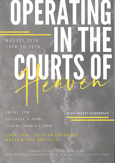 Courts of Heaven – 16th – 18th August Post author:Reformation Post published:July 4, 2019 Post category:Uncategorized Post comments:0 Comments This is a reminder that that Pastor Robert Henderson, the author of the book ‘Courts of Heaven ’will be ministering again at Reformation Harvest Fire Ministries Melbourne (formely kown as Catch The Fire Ministries) from August 16th to 18th 2019. You Might Also Like At our Church 2 weeks ago – washing of feet June 1, 2022 Sunday 26th Sep 2021 | God is Life | Pr John Chee September 26, 2021 Israel’s 70th Anniversary Celebration at CTFM May 18, 2018 Leave a Reply Cancel replyCommentEnter your name or username to comment Enter your email address to comment Enter your website URL (optional) Save my name, email, and website in this browser for the next time I comment.